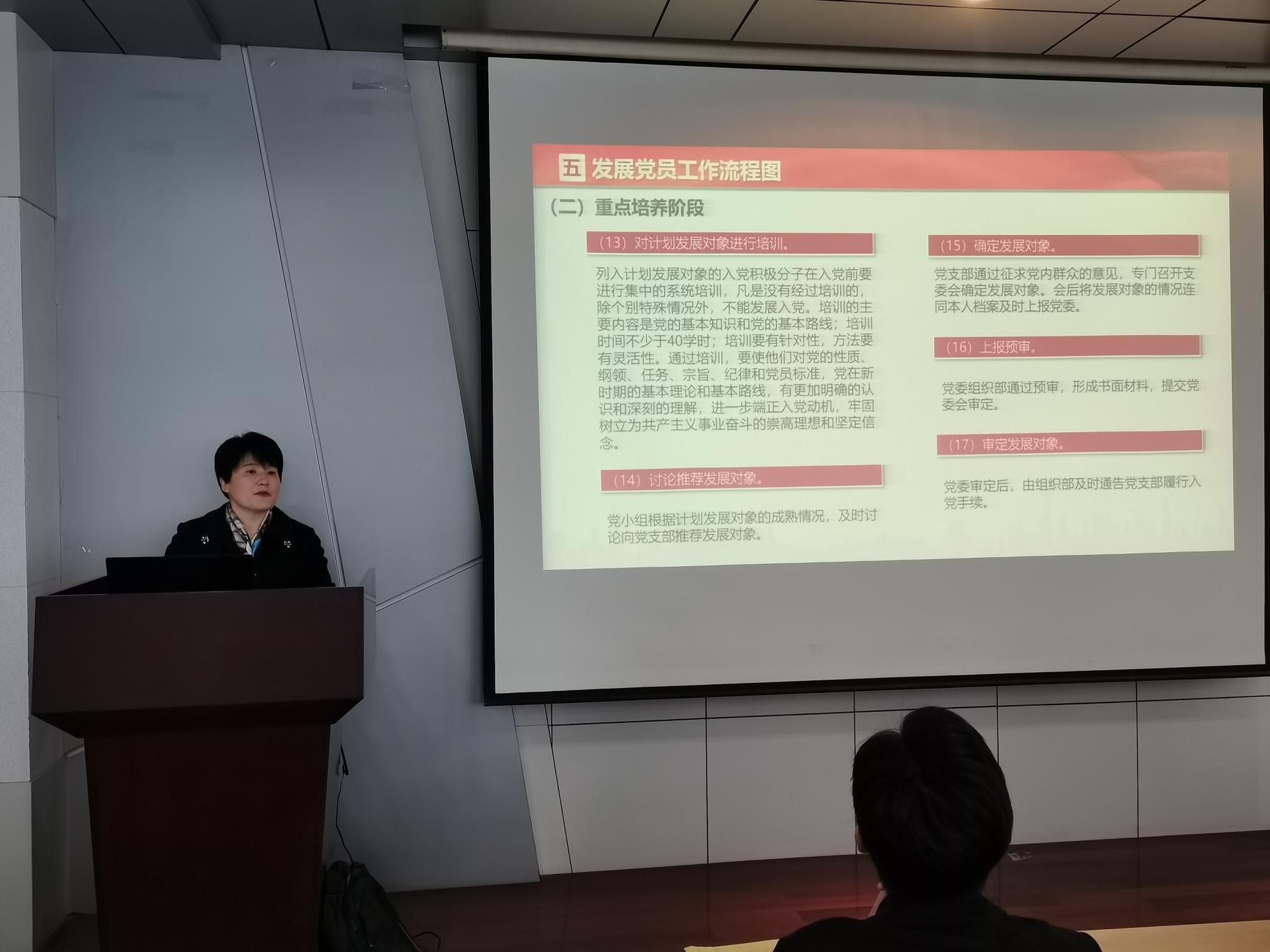 会议伊始,易老师详细介绍了党支部书记和各委员的具体职责和党支部的组织形式。接着,她指出支部“三会一课”召开的基本程序要求和发展党员的具体工作流程。她强调,每位党支部书记都应在工作中保持认真严谨的态度对待工作。随后,易老师对发展党员工作相关表格的内容及填写规范进行了详细的介绍,同时对各支部的工作推进切实提出了一些建议,并指出应引导员工党员提高为人民服务的本领。最后,各支部书记交流讨论了发展员工党员工作中的一些具体问题,并由易老师一一进行解答。